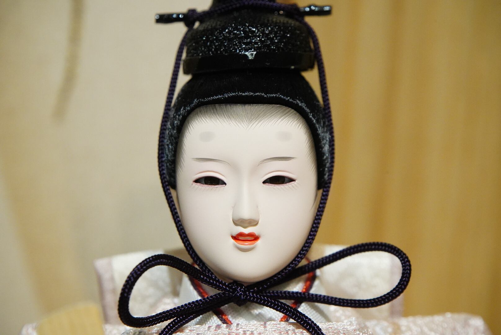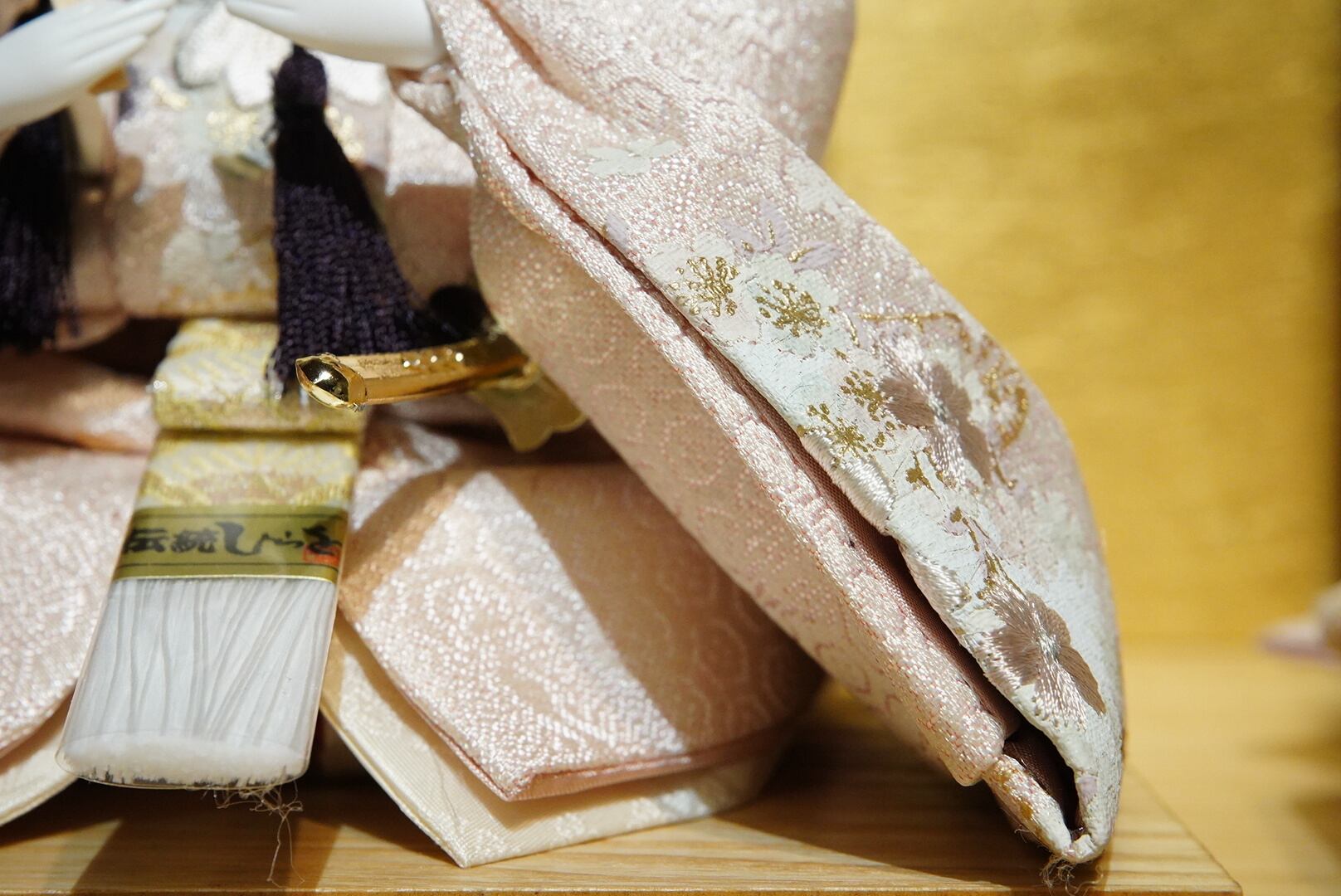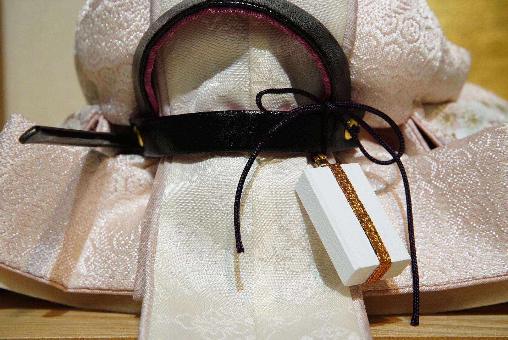 衣裳には繊細な織り模様が施され、淡いピンクとアイボリーを基調とした優美な配色が特徴。