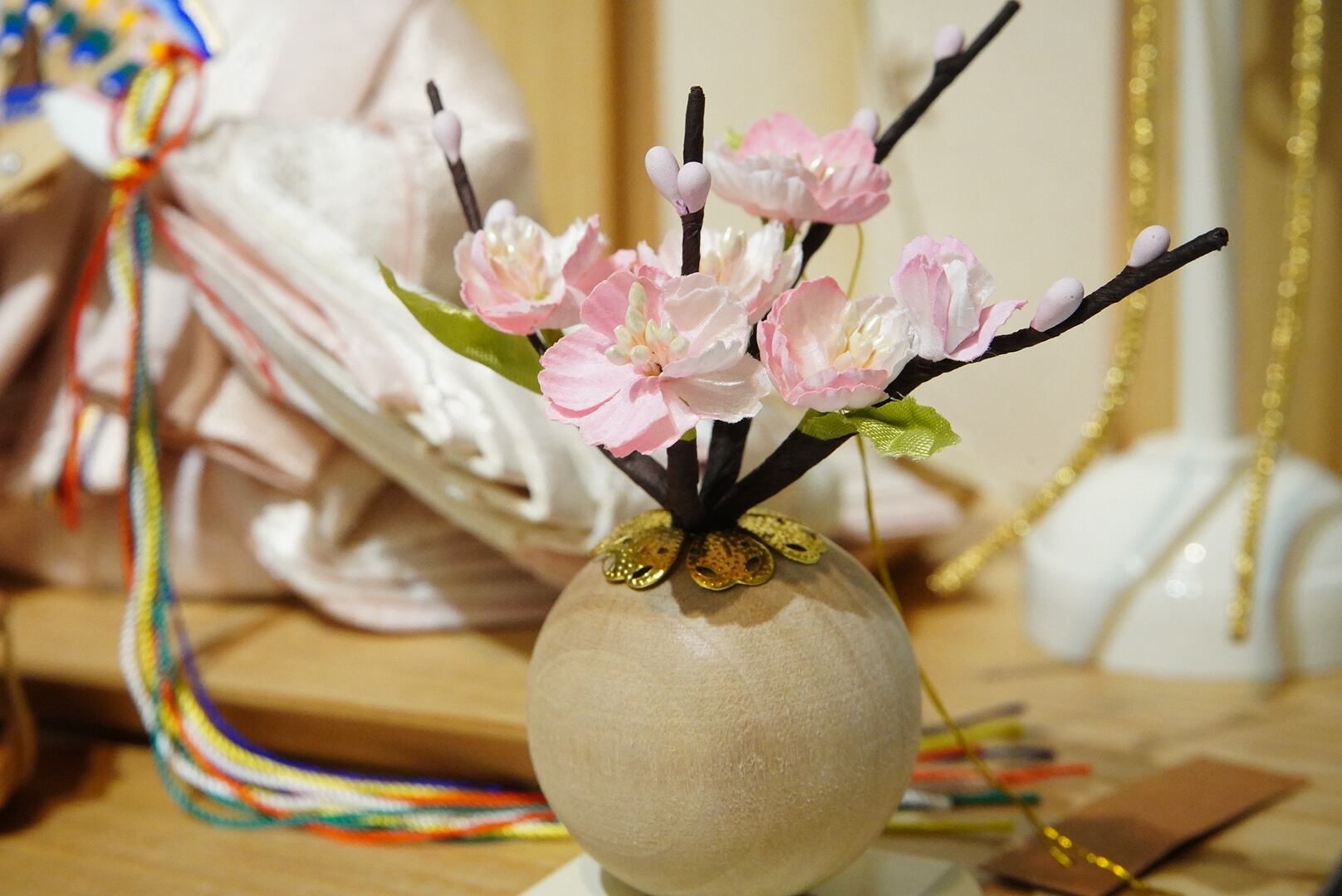 やわらかな色合いの小物と花飾りが調和し、全体に優雅で明るい印象を演出。