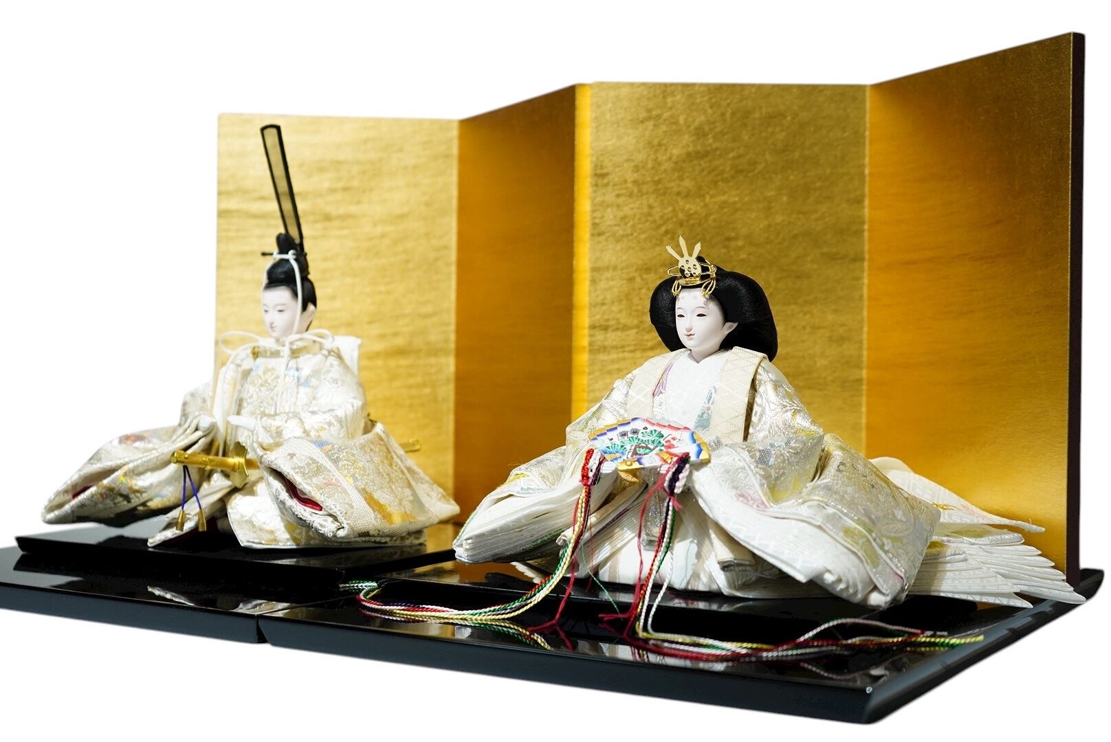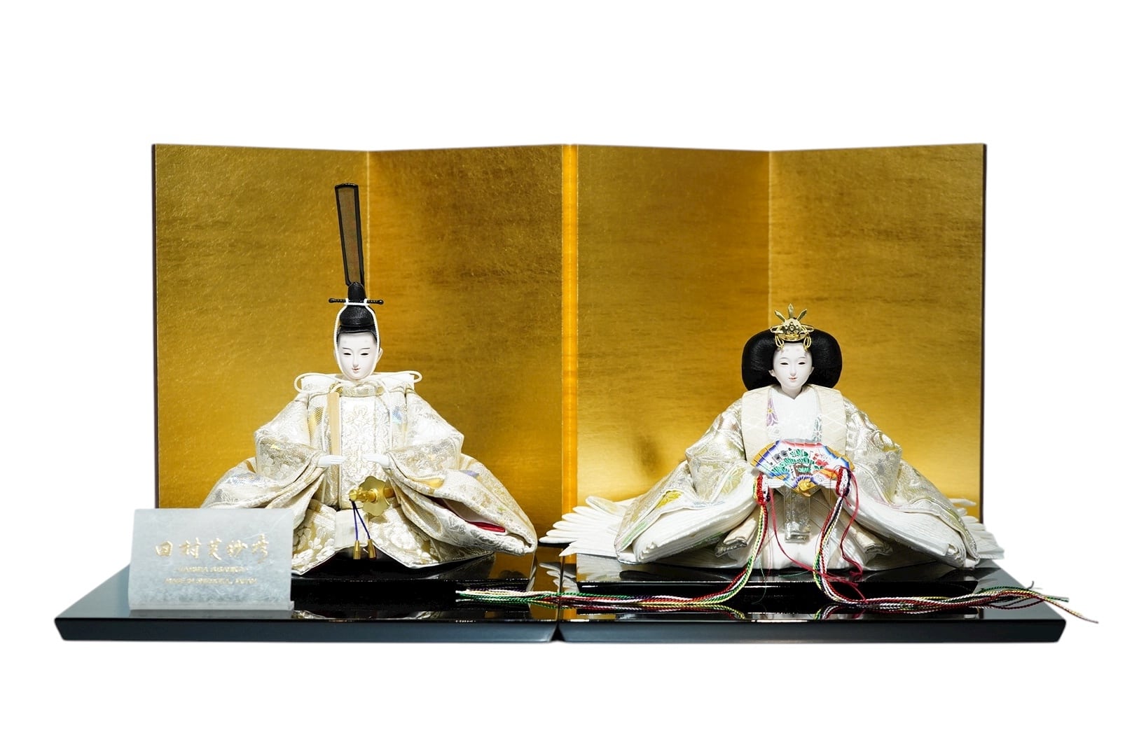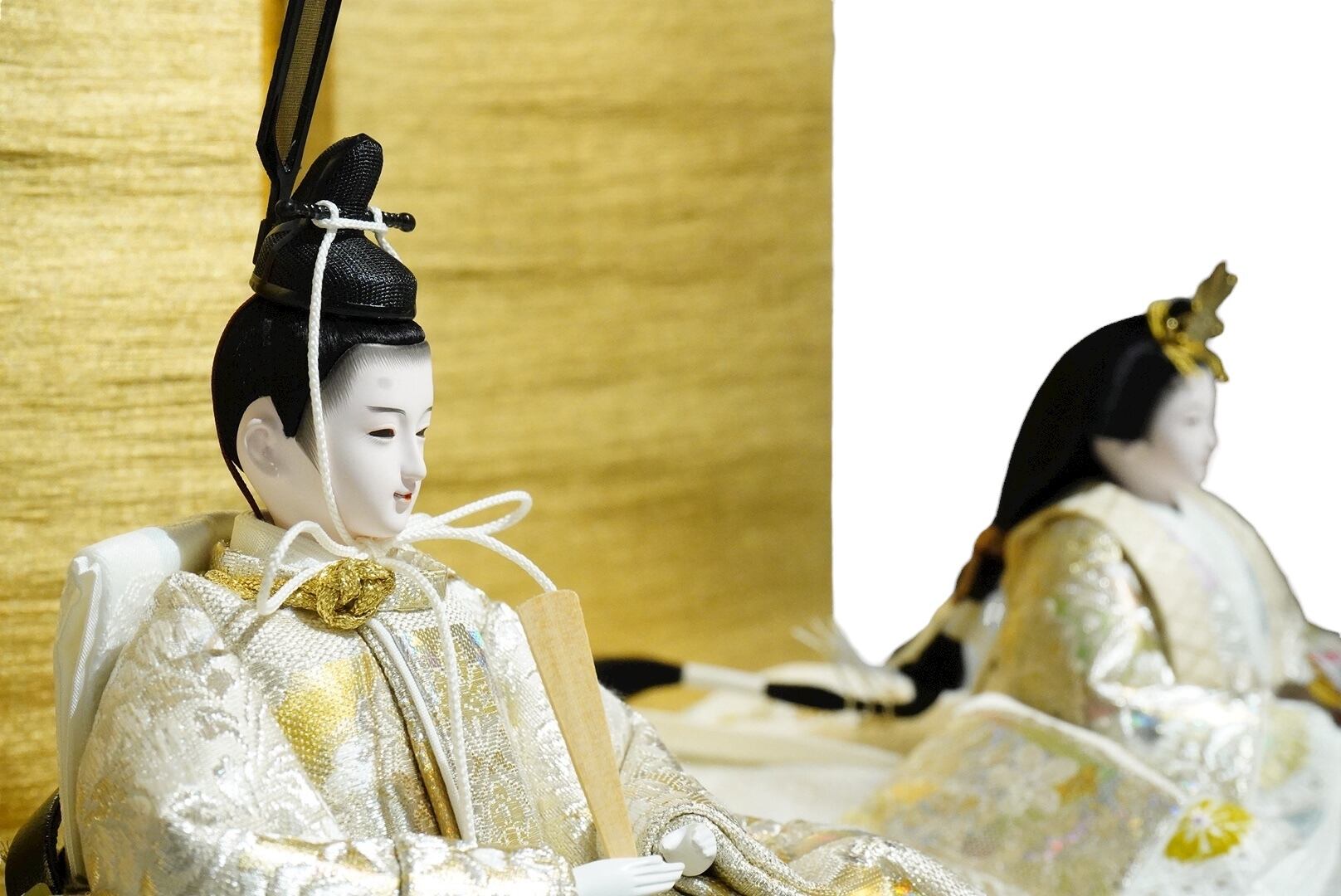 気品と格調を兼ね備えた、白金色の衣装が美しい親王飾り。