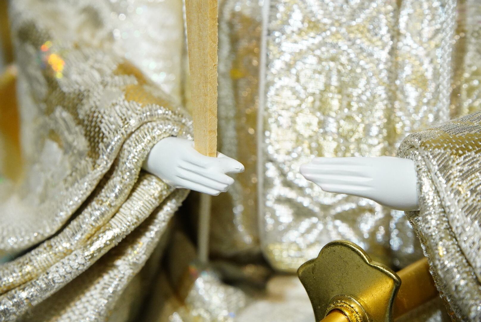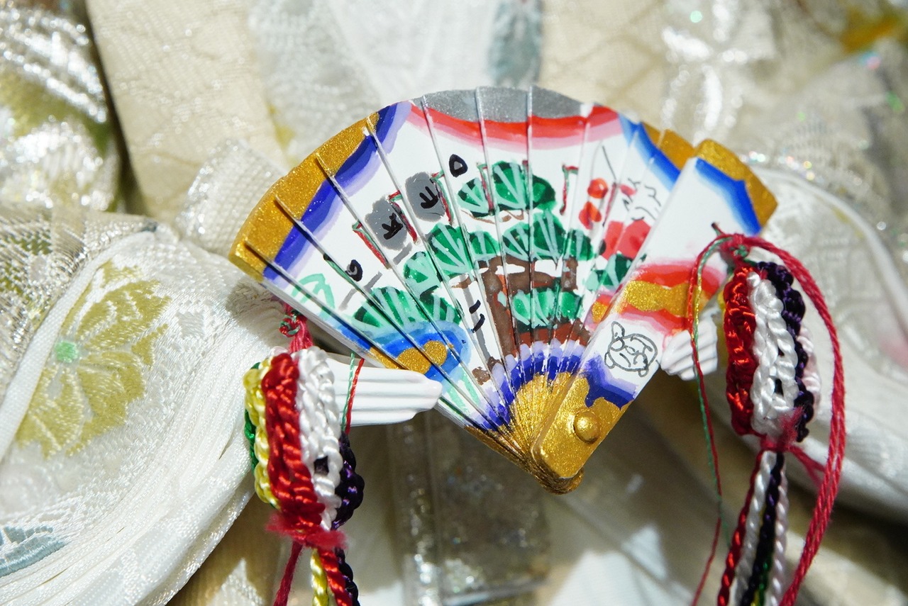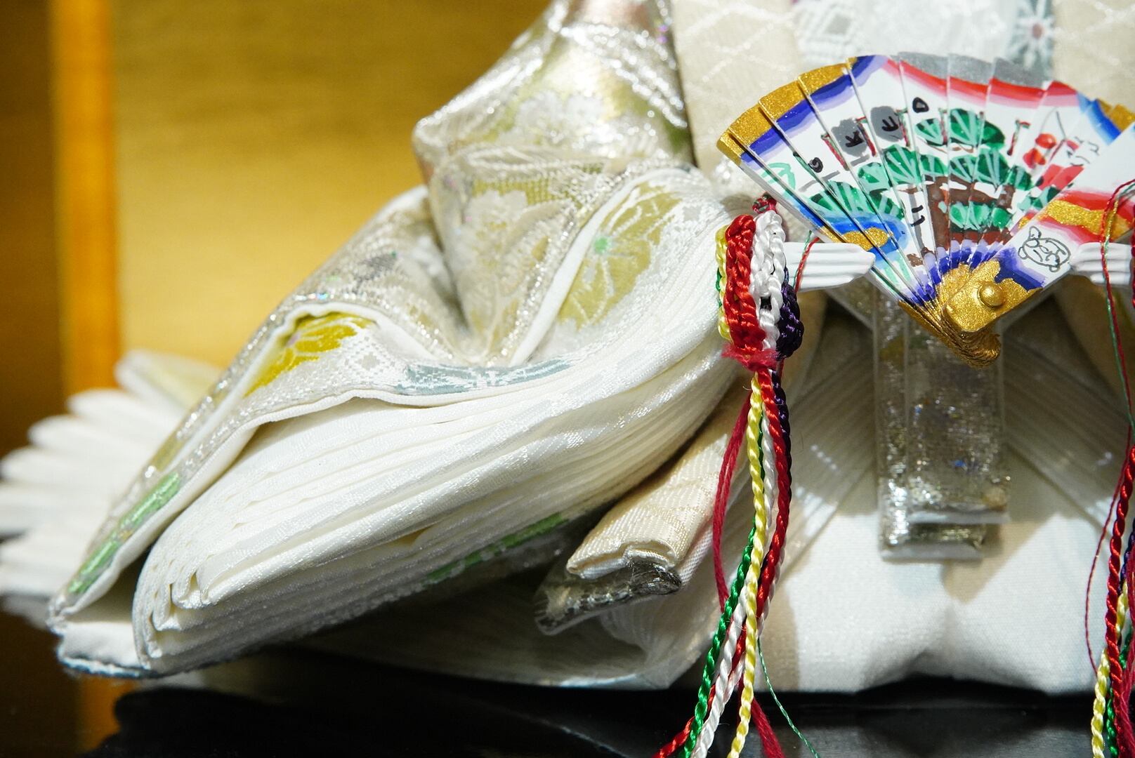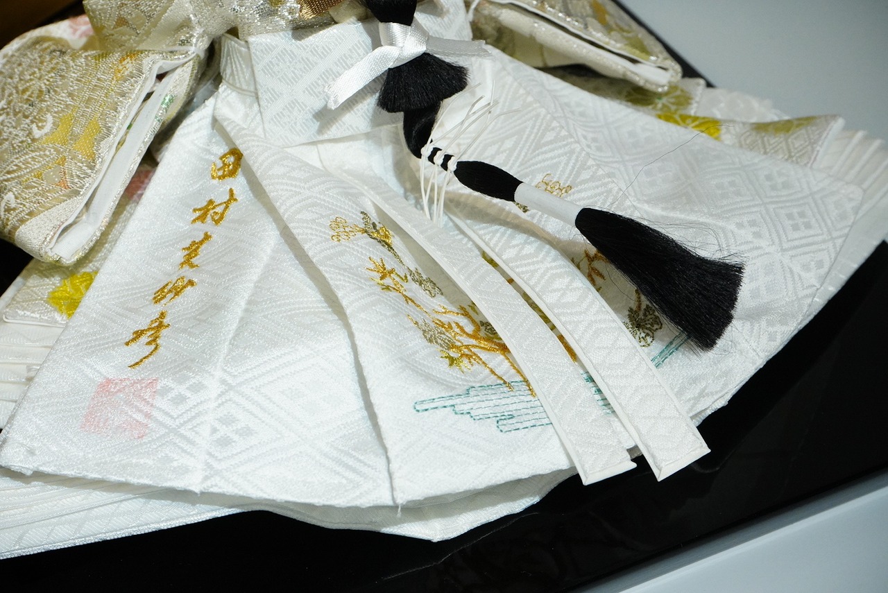 清らかな白を基調に、上品な金糸が織り込まれた衣装は、まるで光をまとったような優雅な輝きを放ちます。
