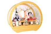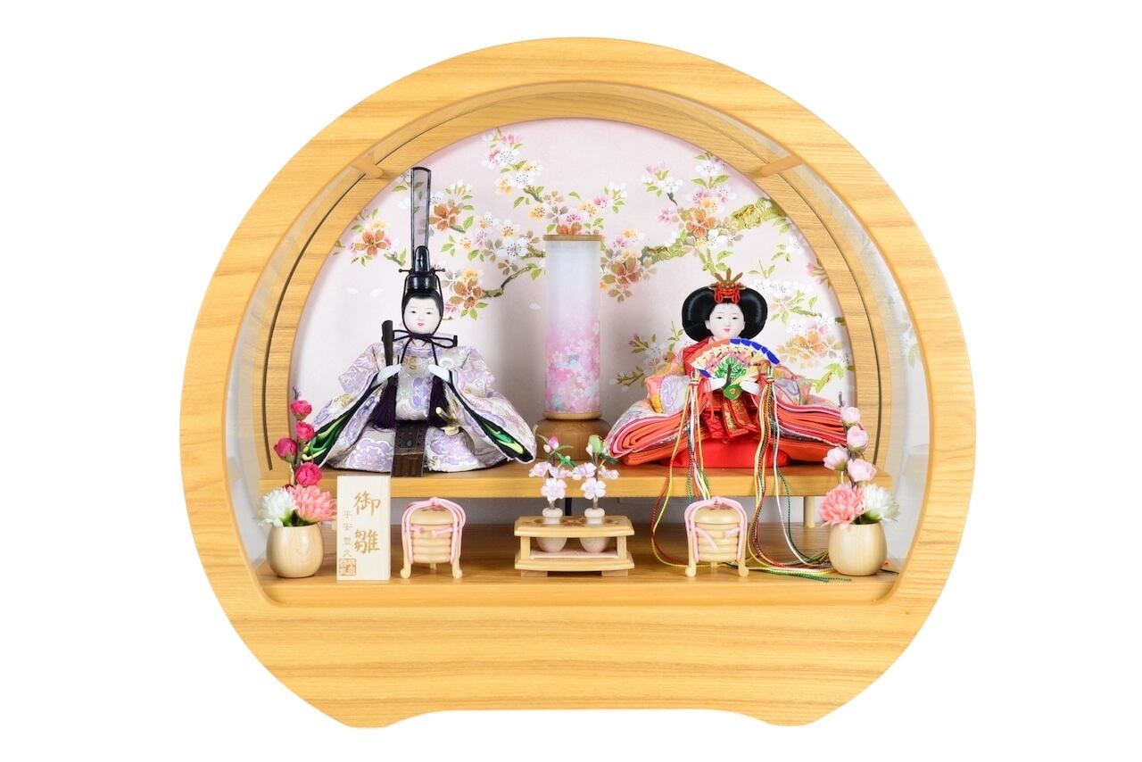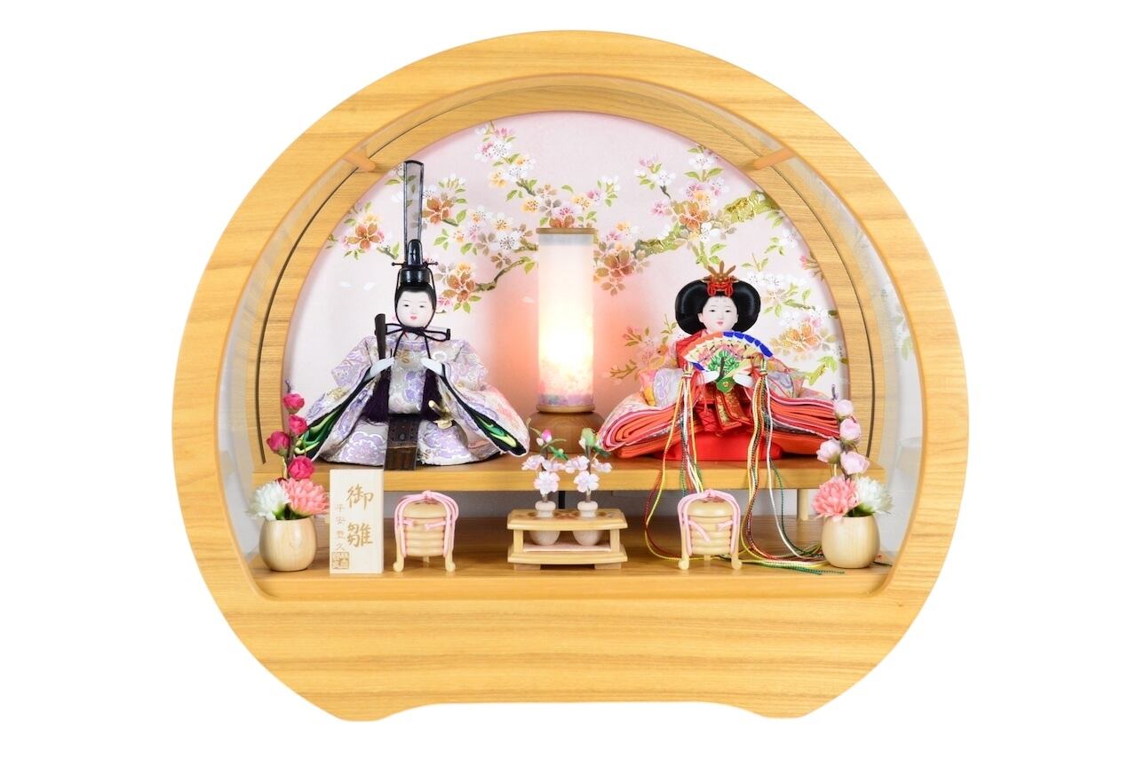 柔らかな木目が美しい丸みのあるケースに、優雅な親王飾りを収めた上品なひな飾りです。ほのかに光を灯す中央の行灯が、ふたりの穏やかな表情をやさしく照らし、あたたかみのある空間を演出します。